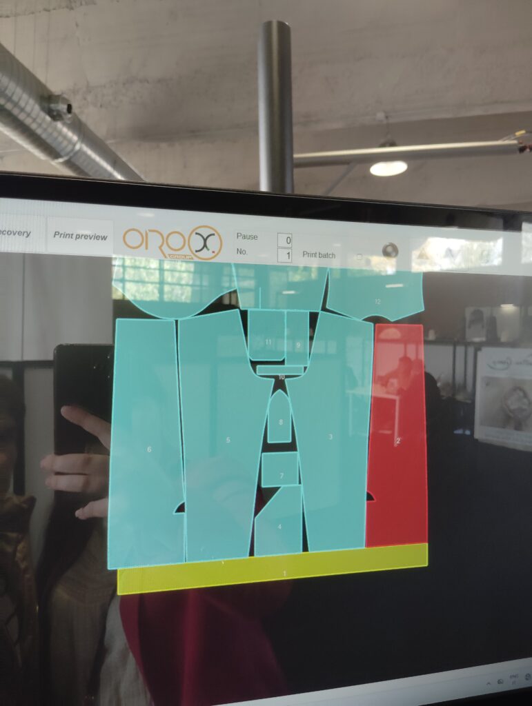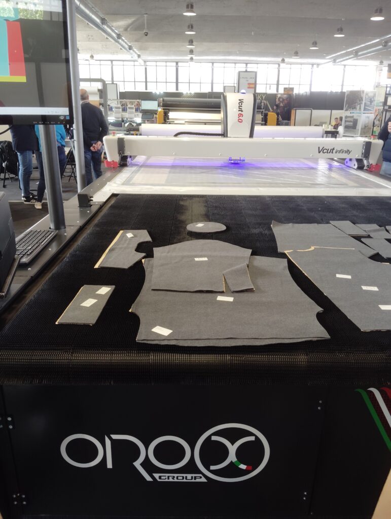 Incluso máquinas muy grandes de corte pensadas especialmente para cortar muchos tejidos en poco tiempo de manera informatizada. Este tipo de maquinaria era de una empresa portuguesa que mostraba como con una entendedora se cortaba en capas la tela y luego un láser cortaba las piezas de tela. A su vez se podía ver la marcada en una pantalla y se imprimían etiquetas para identificar las diferentes piezas.