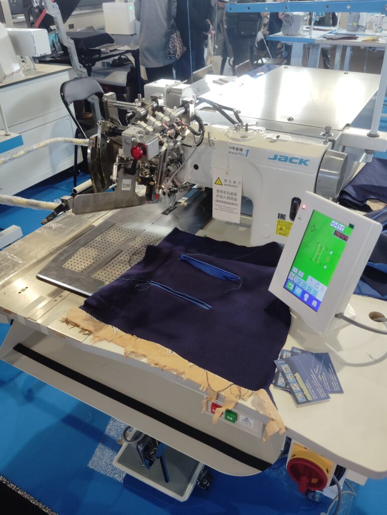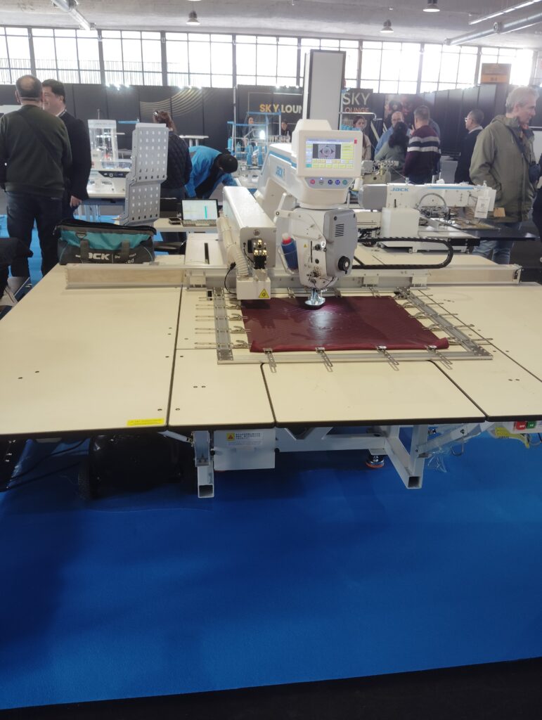 En nuestro caso lo que nos interesaba más era el tema de máquinas y materias primas para poder producir nosotros mismo por ello es donde más nos detuvimos. Encontramos el stand de la marca china JACK conocida por su gran calidad-precio. Actualmente es una de las mayores empresas de producción y comercialización en la industria de la maquinaria de costura en el mundo. Por menos de mil euros se puede adquirir una máquina de coser recto con motor silencioso, de bajo consumo y funciones novedosas. Las últimas novedades en máquinas es el uso de la inteligencia artificial para ajustar la tensión del hilo en función del material que cosemos. Se podía ver y adquirir folletos de otro tipo de máquinas como overlock, recubridora, máquina de coser botones, máquina autómata de hacer bolsillos ojal en un paso, doble arrastre…